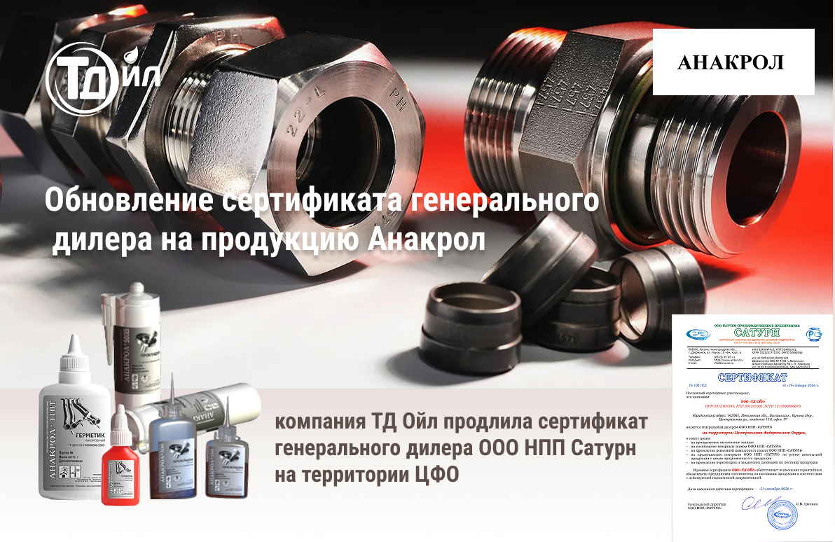 Компания ТД Ойл продлила сертификат генерального дилера ООО НПП «Сатурн» на территории Центрального федерального округа. Что сохраняет клиентам компании приоритетные сроки исполнения заказов производителем, доступ к инновационным материалам и гарантированное качество продукции.